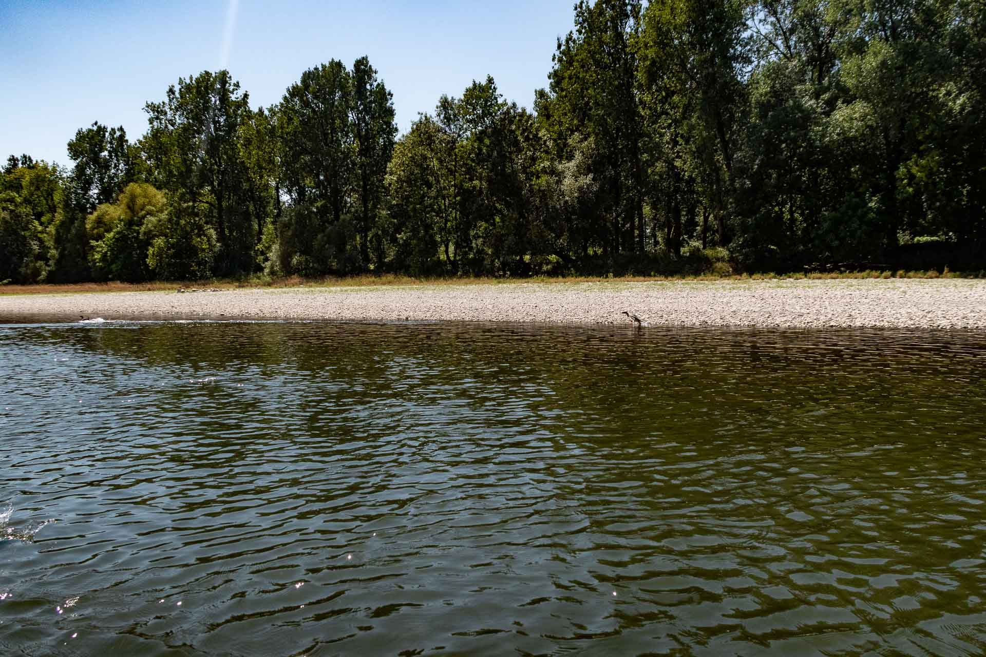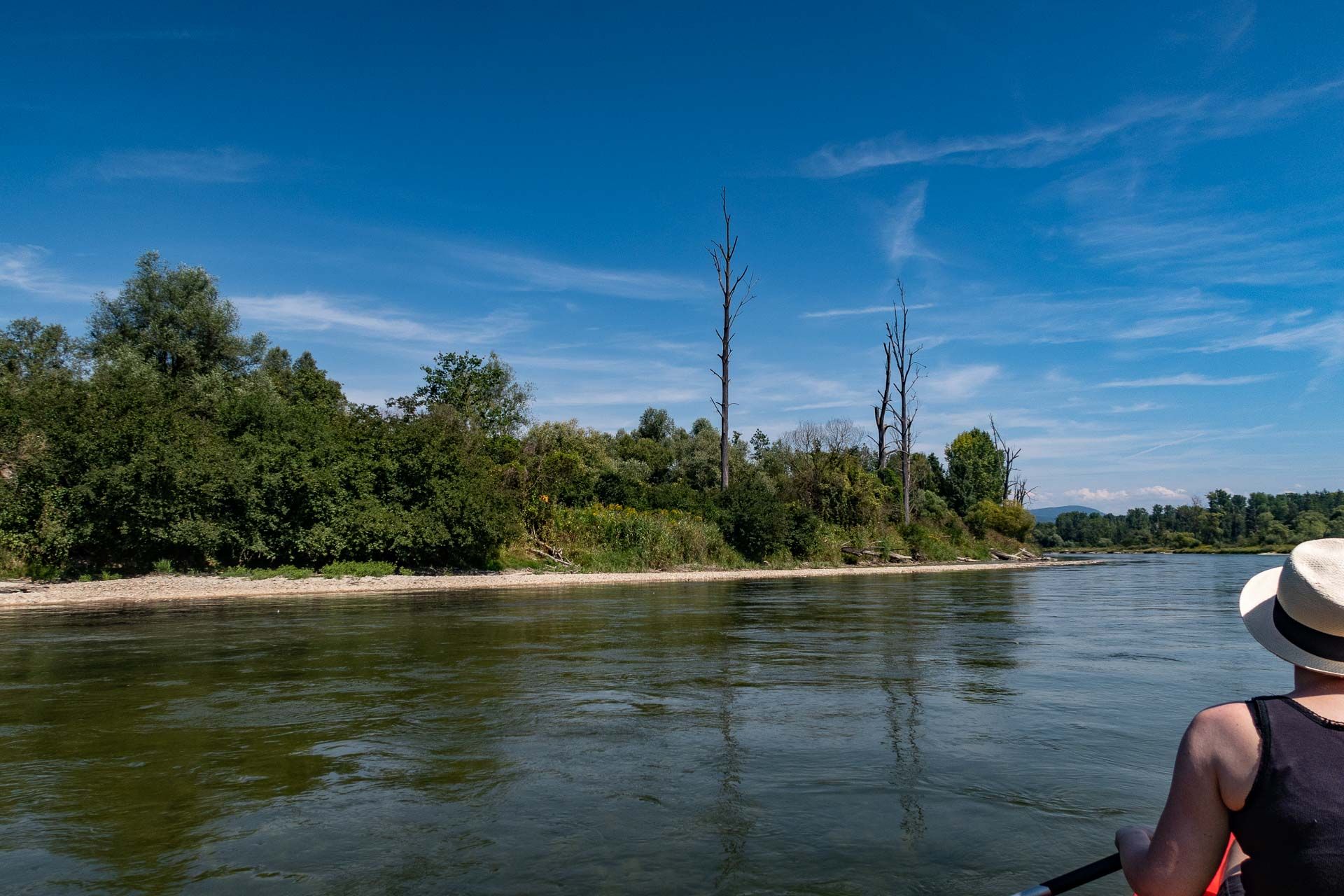 Wir paddelten also schön im Bereich des flußabwärts rechts liegenden Ufers bis zum Mühlhammer Keller. Begleitet von unzähligen Haubentauchern, Flussmöwen und Kormoranen trafen wir immer wieder auf Badende. Ja sowohl in Isar als auch Donau kann man baden gehen. An manchen Stellen sind Zufahrtsmöglichkeiten beinahe bis an die Ufer. Ich werde sie Euch nicht verraten. Die dort Badenden sollen ihre Kleinode noch lange einsam geniessen können. Entlang der Donau wird die Kanutour dann doch anstrengend und bis zum Ziel streckt sich der Fluss beinahe unendlich auf diesem etwas mehr als neun km langen Abschnitt. Empfehlenswert ist die Mitnahme einer kleinen Brotzeit, denn mit dem Kanu kann man beinahe überall an’s Ufer gelangen und dort kurz verweilen oder gar ein erfrischendes Bad nehmen.