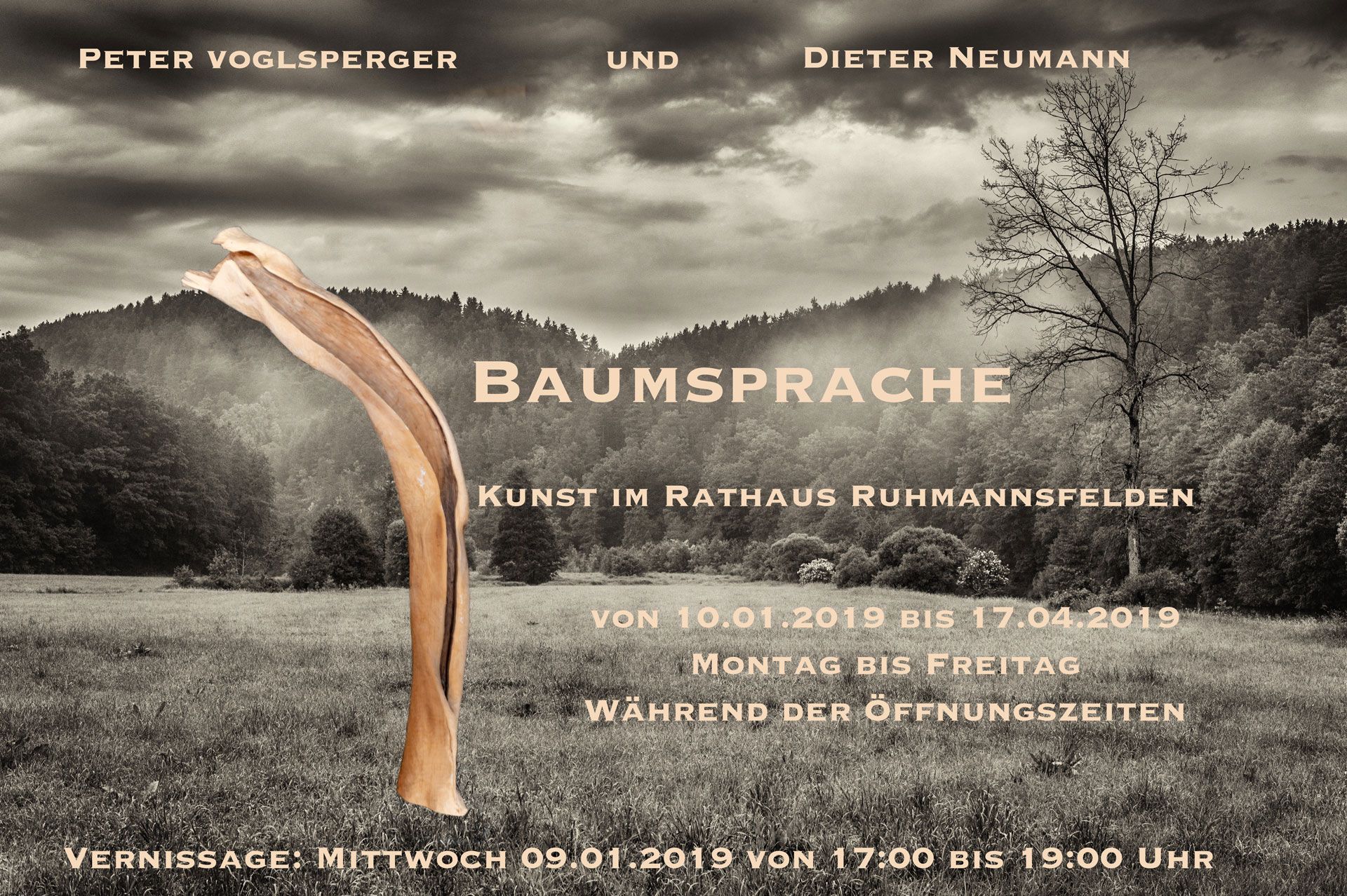 ...war meine zweite Ausstellung im Rathaus Ruhmannsfelden. Zusammen mit dem Skulpturen-Künstler Peter Voglsperger präsentierte ich schwarz-weiß-Fotografien zum Thema Wald, Baum und Holz. Diese Ausstellung konnte vom 10.01.2019 bis 15.04.2019 besichtigt werden. Das Rathaus Ruhmannsfelden entwickelt sich zu einer kleinen, aber feinen Kunstgalerie. Demnächst wird ein Teil der Ausstellungsbilder als Leihgabe präsentiert.