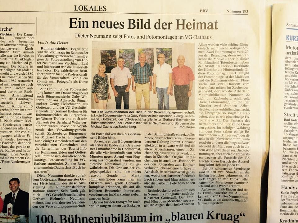 …alle Bilder wurden mit meiner Nikon D 800 und den dazugehörigen Objetkiven “geschossen”. Gezeigt wurden Luftaufnahmen sowie Fotomontagen und Panorama-Fotos. So habe ich zum Beispiel die “Gemeinde-Ansichten” der zur Verwaltungsgemeinschaft zählenden Gemeinden Achslach, Gotteszell, Ruhmannsfelden und Zachenberg an einem Sommer-Nachmittag kurz vor Sonnenuntergang innerhalb einer Flugzeit von ca. zehn Minuten fotografiert – Ergebnis: alle vier Orte haben die gleiche Lichtstimmung. Zusätzlich benutzte ich die Kamera im Hochformat.