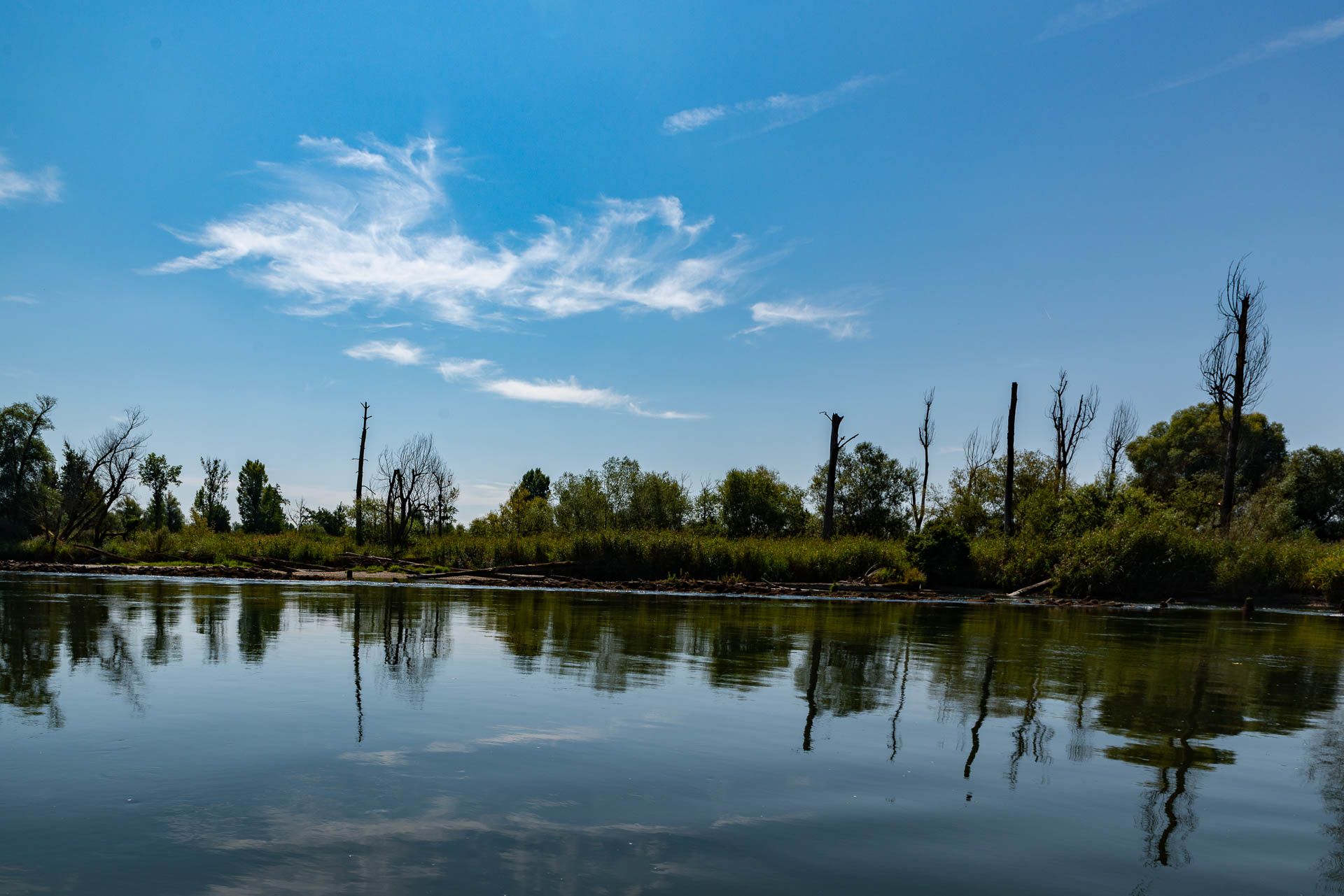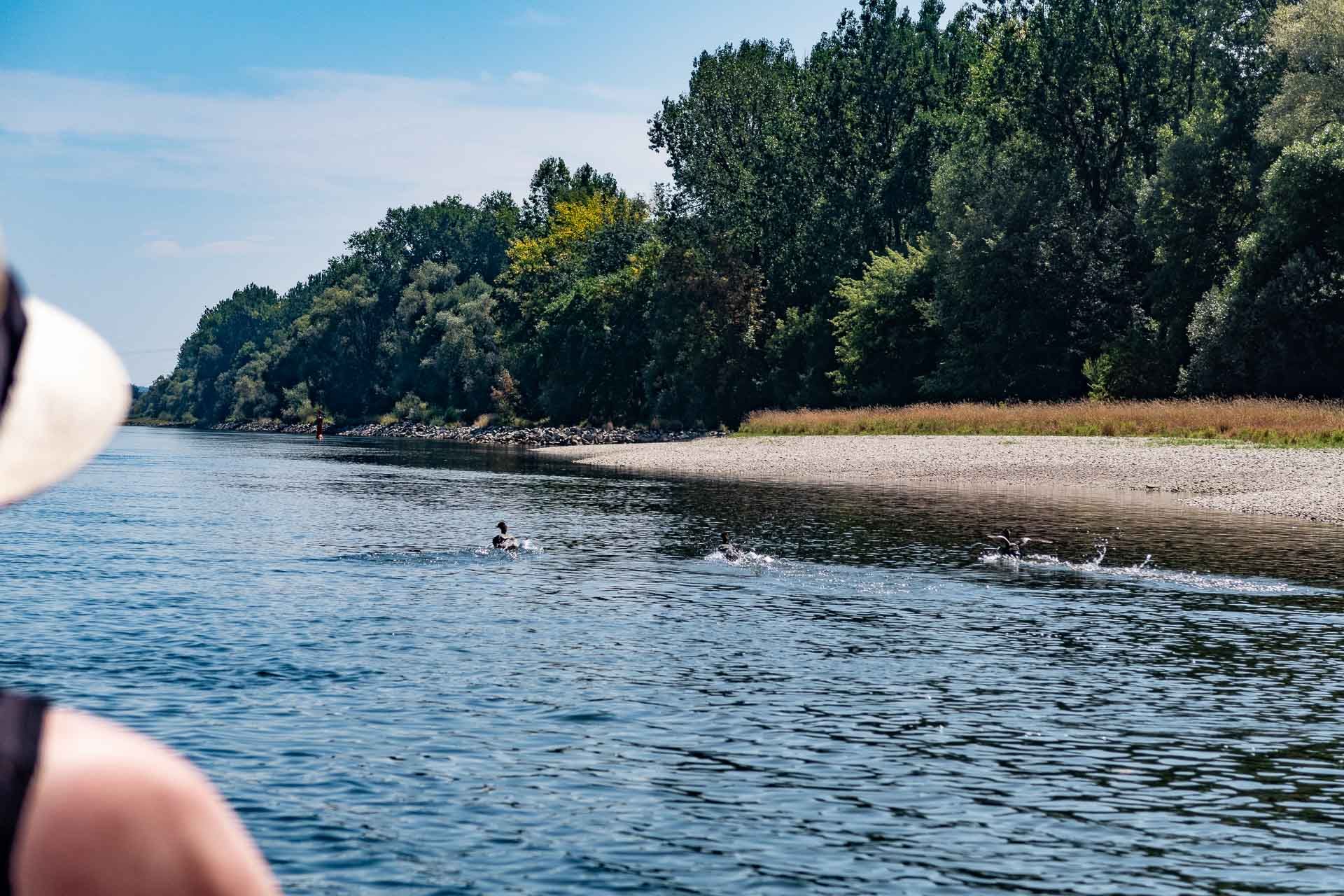 Wir paddelten also schön im Bereich des flußabwärts rechts liegenden Ufers bis zum Mühlhammer Keller. Begleitet von unzähligen Haubentauchern, Flussmöwen und Kormoranen trafen wir immer wieder auf Badende. Ja sowohl in Isar als auch Donau kann man baden gehen. An manchen Stellen sind Zufahrtsmöglichkeiten beinahe bis an die Ufer. Ich werde sie Euch nicht verraten. Die dort Badenden sollen ihre Kleinode noch lange einsam geniessen können. Entlang der Donau wird die Kanutour dann doch anstrengend und bis zum Ziel streckt sich der Fluss beinahe unendlich auf diesem etwas mehr als neun km langen Abschnitt. Empfehlenswert ist die Mitnahme einer kleinen Brotzeit, denn mit dem Kanu kann man beinahe überall an’s Ufer gelangen und dort kurz verweilen oder gar ein erfrischendes Bad nehmen.