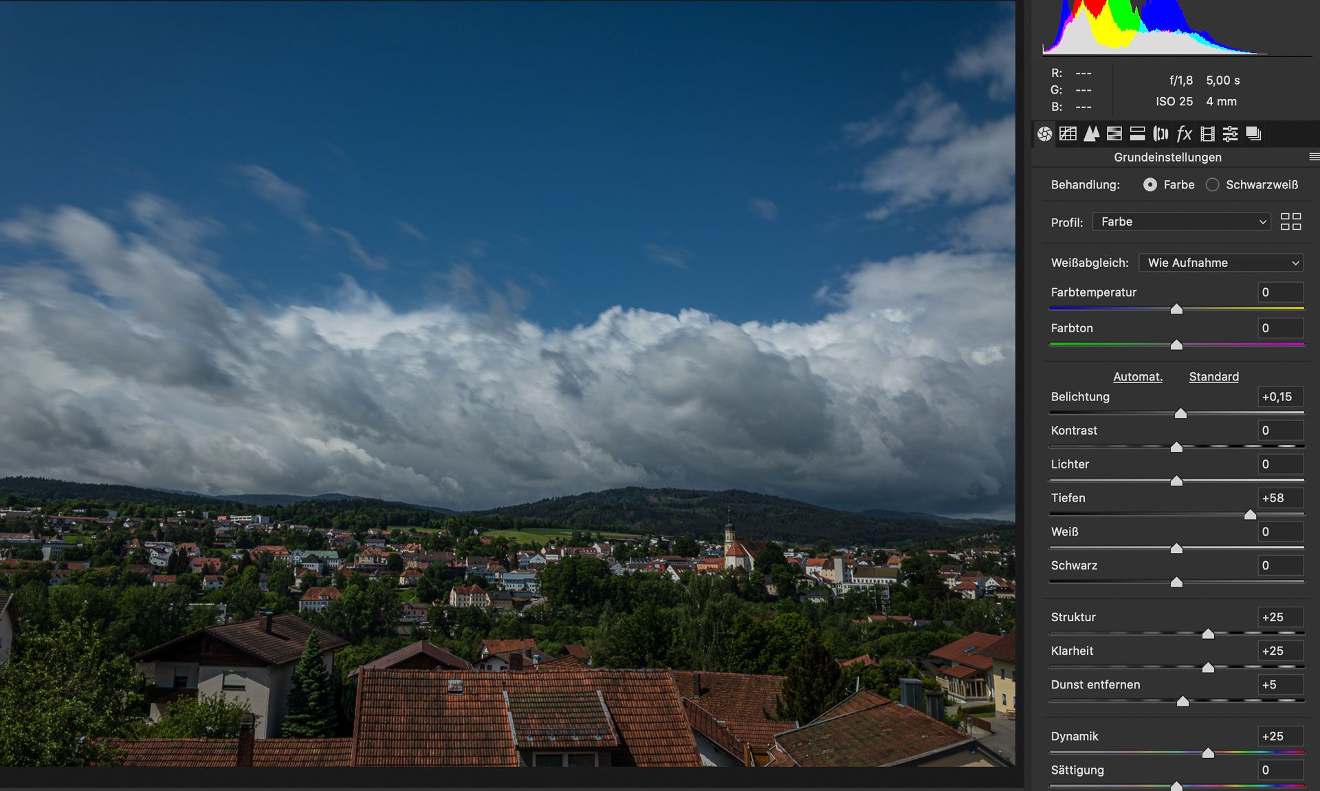 Als erstes habe ich die Iphone-8-Kamera im Modus „Foto“ eingesetzt. Auf den „live-Modus“ habe ich bewusst verzichtet. Anschließend kam die Lightroom-Kamera im Modus Langzeitbelichtung mit jeweils 5 Sekunden Belichtungszeit dran. Die Fotos der Lightroom-Kamera sind im „Raw-Modus“ als PNG fotografiert; könnten somit nachträglich in Lightroom bzw. ACR entwickelt werden.