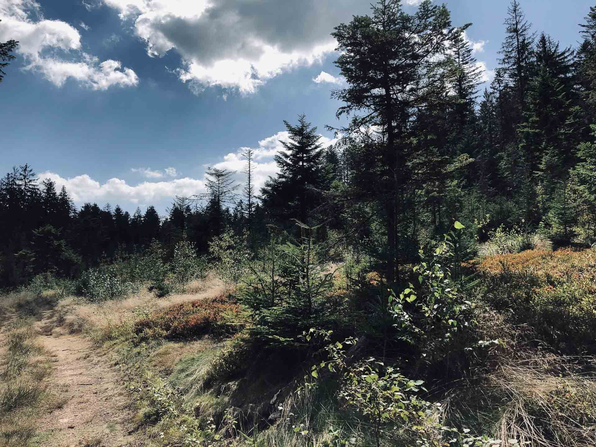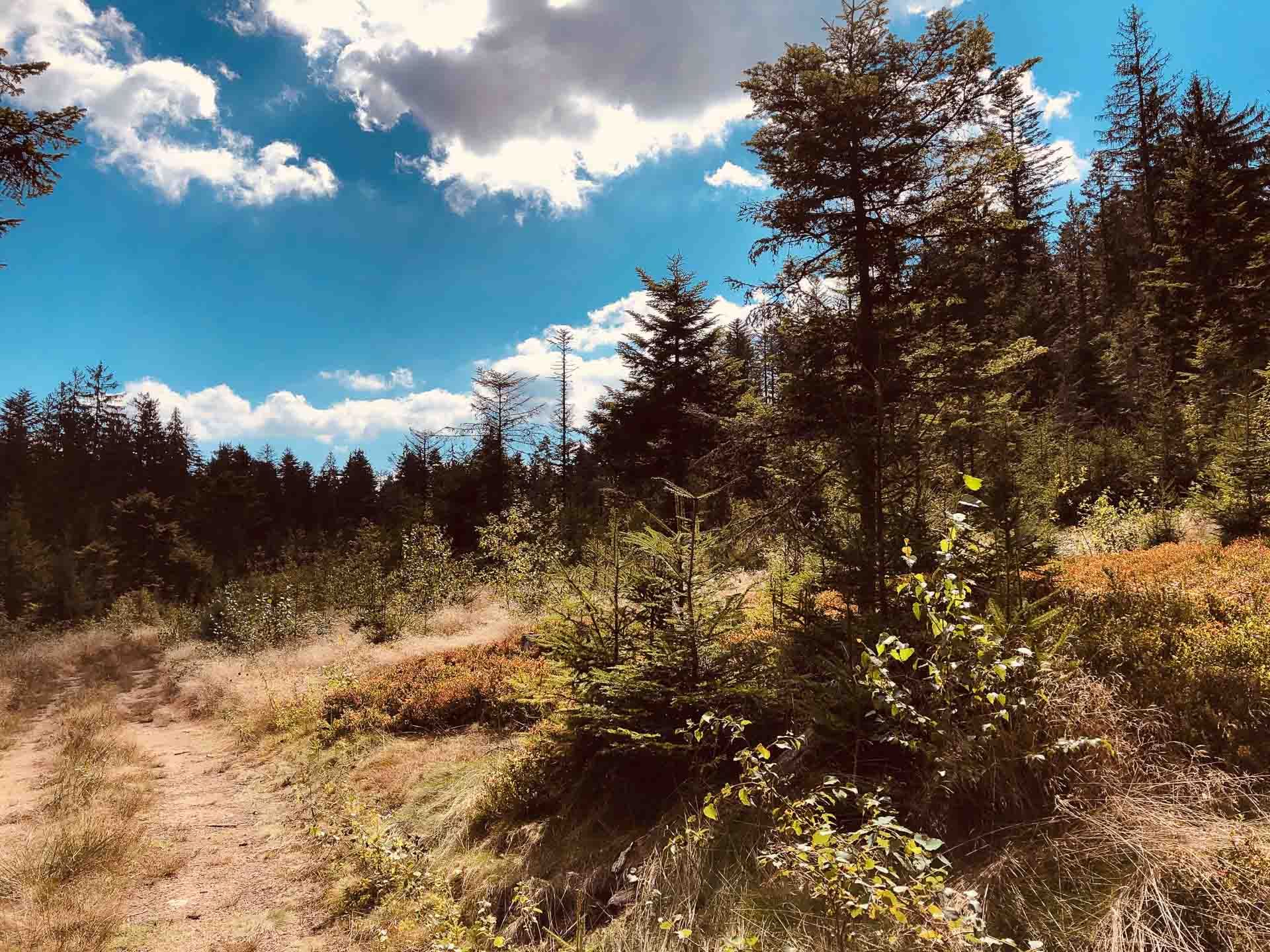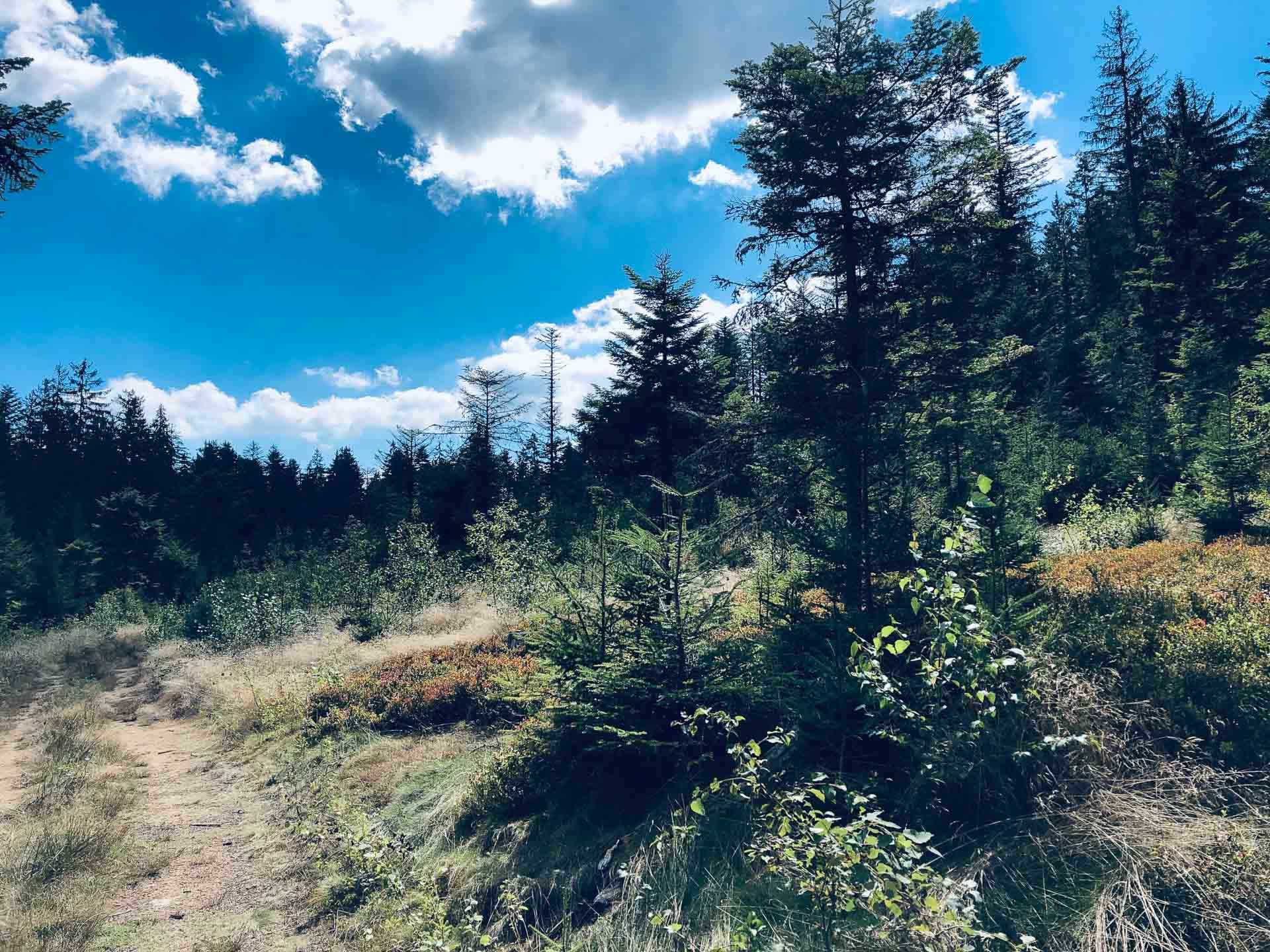 Die IPhone-Foto-Farbvarianten zeigen eine Landschaft im Bayerischen Wald entlang des Wanderweges Nr 10 in Viechtach samt Wolken und blauem Himmel.